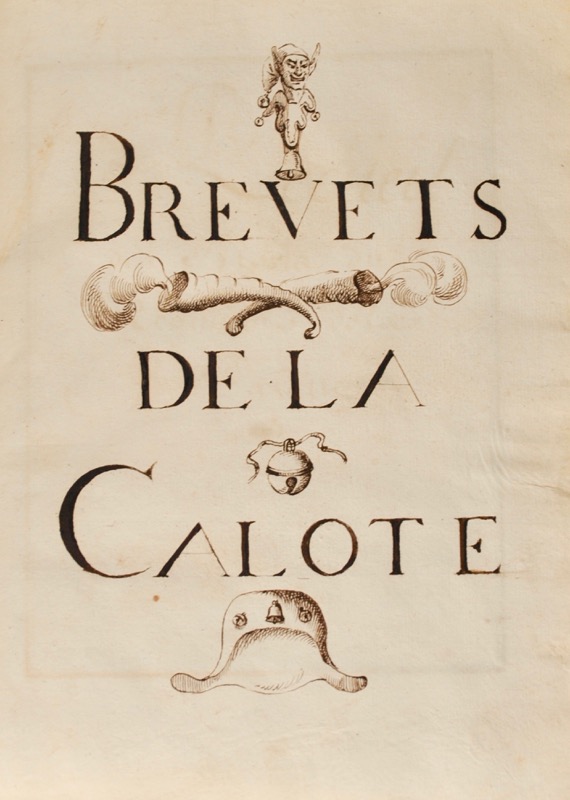 [Régiment de la Calotte. Manuscrit]. Recueil des Brevets du Régiment de la Calotte. Se vend chez Momon libraire Place des Ris au Miroir sans fard.
