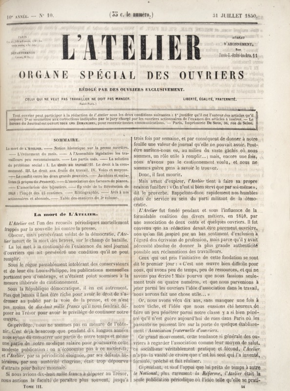 L'Atelier. Organe des intérêts moraux et matériels des ouvriers.