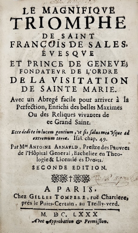 Le Magnifique Triomphe de saint François de Sales, Evesque et Prince de Genève ; Fondateur de l'Ordre de la Visitation de Sainte Marie. Avec un Abrégé facile pour arriver à la Perfection, Enrichi des belles maximes ou des Reliques vivantes de ce Grand Saint.