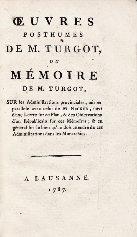 Oeuvres Posthumes de M. Turgot, ou Mémoire de M. Turgot Sur les Administrations provinciales, mis en parallèle avec celui de M. Necker, suivi d'une Lettre sur ce Plan, & des Observations d'un Républicain sur ces Mémoires ; & en général sur le bien qu'on doit attendre de ces Administrations dans les Monarchies.