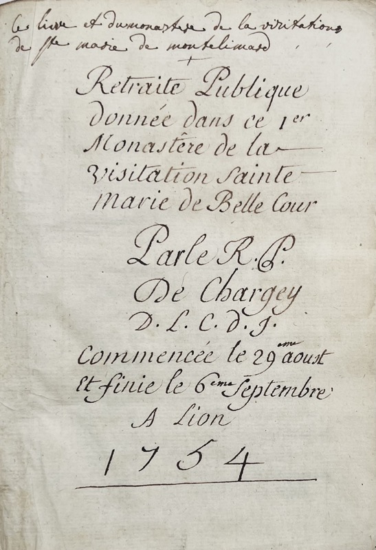 [Lyon. Chapelle de la Visitation Sainte-Marie de Bellecour. Manuscrit]. Retraite Publique donnée dans ce 1er monastère de la Visitation Sainte-Marie de Bellecour. Par le R.P. de Chargey D.L.C.D.J commencée le 29 aoust et finie le 6ème septembre à Lion.