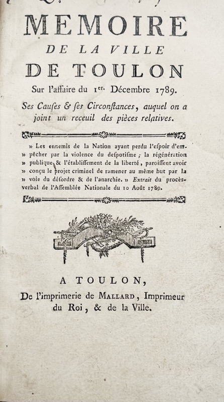 [Toulon. Révolution]. Mémoire de la ville de Toulon sur l'affaire du 1er décembre 1789. Ses causes et ses circonstances auquel on a joint un recueil des pièces relatives.