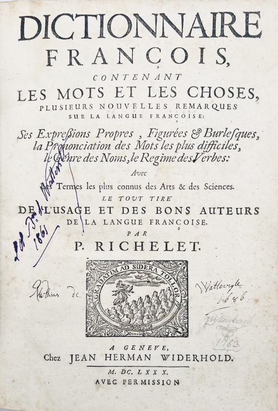 Dictionnaire françois, contenant les Mots et les Choses, plusieurs nouvelles remarques sur la Langue Françoise : Ses Expressions Propres, Figurées & Burlesques, la Prononciation des Mots les plus difficiles, le Genre des Noms, le Régime des Verbes. Avec les Termes les plus connus des Arts et des Sciences. Le Tout Tiré de l'Usage et des bons Auteurs de la Langue Françoise.