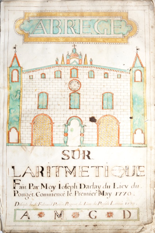 [Hérault. Le Pouget. Pouzols. Manuscrit]. Abrégé sur l’Arithmétique fait par Moi Joseph Darlay du Lieu du Pouget. Commencé le Premier May 1770. Disciple du Sr. Fulerand Portier. Regent du Lieu de Pousols l’année 1770. A*M*G*D.