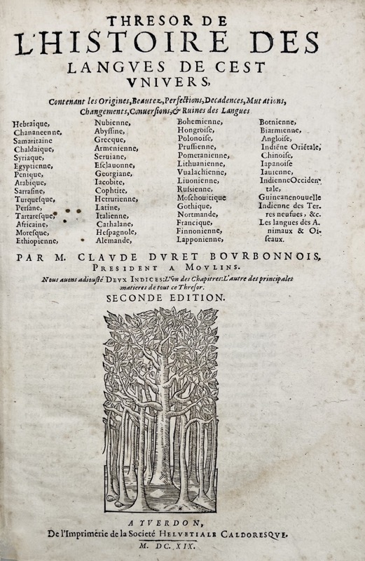 Thresor de l’histoire des Langues de cest Univers contenant les Origines, Beautés, Perfections, Décadences, Mutations, Changements, Conversions, & Ruines des Langues. Par M. Claude Duret Bourbonnois, President à Moulins.