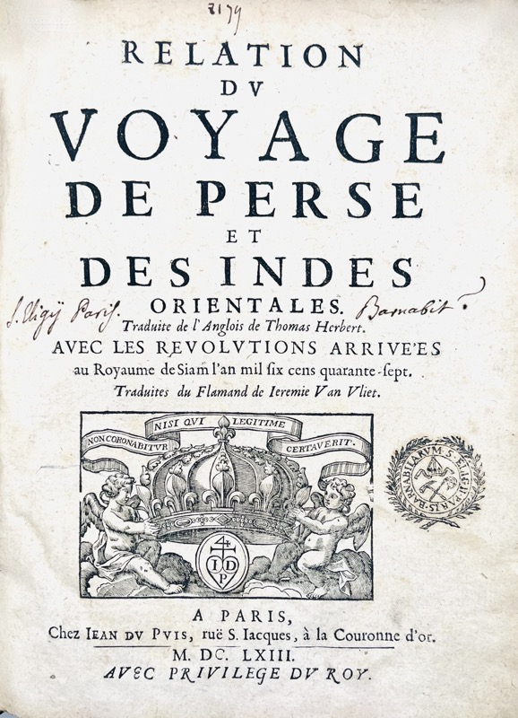 Relation du voyage de Perse et des Indes Orientales. Traduites de l'anglais de Thomas Herbert avec les révolutions arrivées au royaume de Siam l'an mil six cens quarante-sept. Traduites du Flamand de Jérémie Vliet.