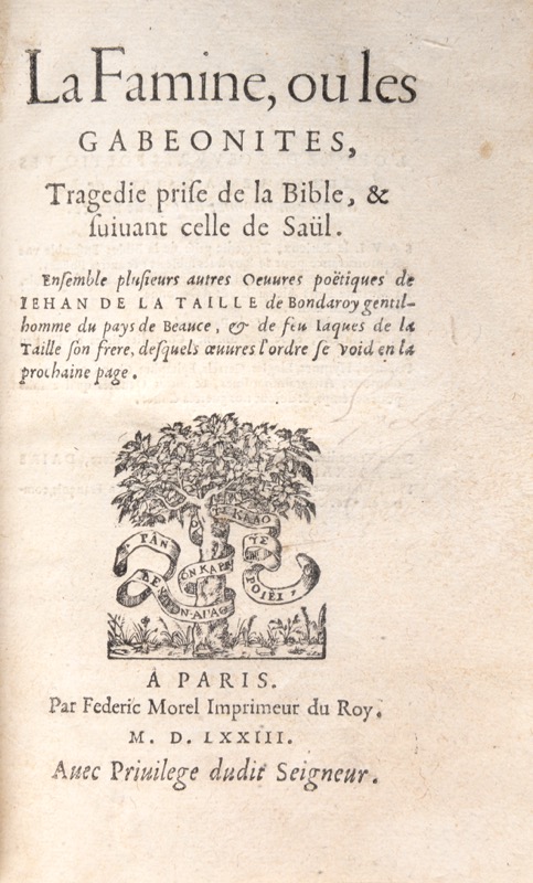 La Famine, ou les Gabeonites, Tragedie prise de la Bible, & suivant celle de Saül. Ensemble plusieurs autres Oeuvres poëtiques de Jehan de la Taille de Bondaroy gentil-homme du pays de Beauce, & de feu Jaques de la Taille son frere, desquels oeuvres l'ordre se void en la prochaine page.