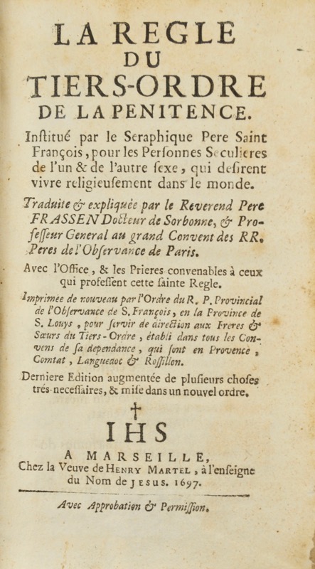 La Règle du Tiers-ordre de la Pénitence. Institué par le Seraphique Père S. François, pour les personnes séculieres de l'un & de l'autre sexe, qui désirent vivre religieusement dans le monde. Traduite & expliquée par le R. P. Frassen, Doxteur de Sorbonne & Professeur général au grand Convent des RR. Pères de l'Observance de Paris. Avec l'Office, & les Prières convenables à ceux qui professent cette sainte Règle.