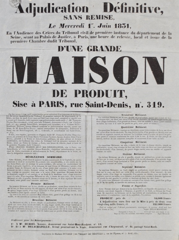 [Paris. Adjudication définitive. Grande Maison de Produit. 1831]. De par le Roi, la Loi et justice. adjudication définitive, sans remise, le mercredi 1er Juin 1831, en l'audience des criées du Tribunal civil de première Instance du département de la Seine, séant au Palais de justice, à Paris, une heure de relevée, local et issue de la première chambre dudit Tribunal, d'une Grande Maison de Produit, sise à Paris, rue Saint-Denis, n° 319.