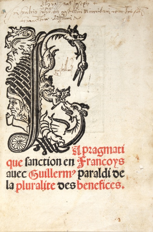 La Pragmatique Sanction en Francoys avec Guillerm[us] paraldi de la pluralite des benefices.