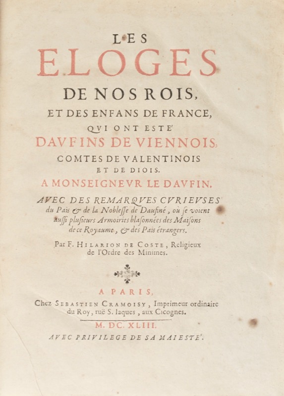 Les éloges de nos Rois, et des Enfants de France, qui ont esté daufins de Viennois, comtes de Valentinois et de Diois. A Monseigneur le Dauphin. Avec des remarques curieuses du Pais & de la Noblesse de Daufiné, où se voient aussi plusieurs Armoiries blasonnées des Maisons de ce Royaume, & des Pais étrangers.