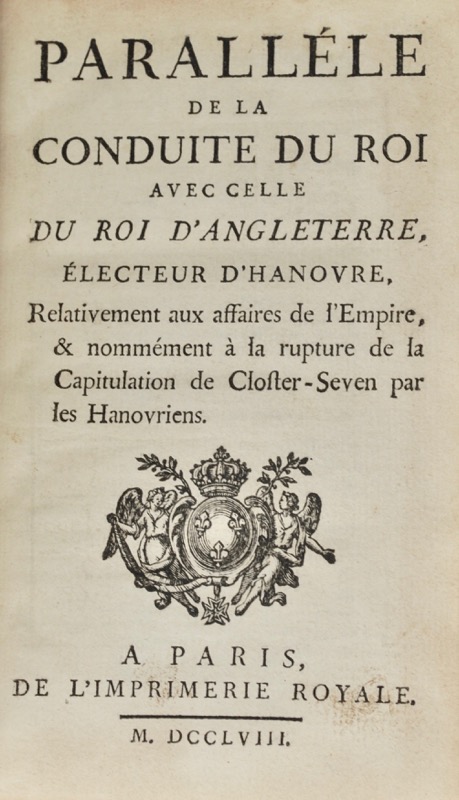[Guerre de Sept ans. Jersey et Guernesey]. Paralléle de la conduite du Roi avec celle du roi d'Angleterre, électeur d'Hanovre, relativement aux affaires de l'Empire, & nommément à la rupture de la capitulation de Closter-Seven par les Hanovriens.