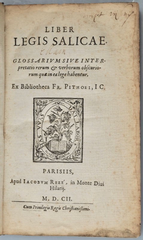 [Loi Salique]. Liber legis salicae. Glossarium sive interpretatio rerum et verborum obscuriorum quae in ea lege habentur. Ex bibliotheca Fr. Pithoei, J. C.