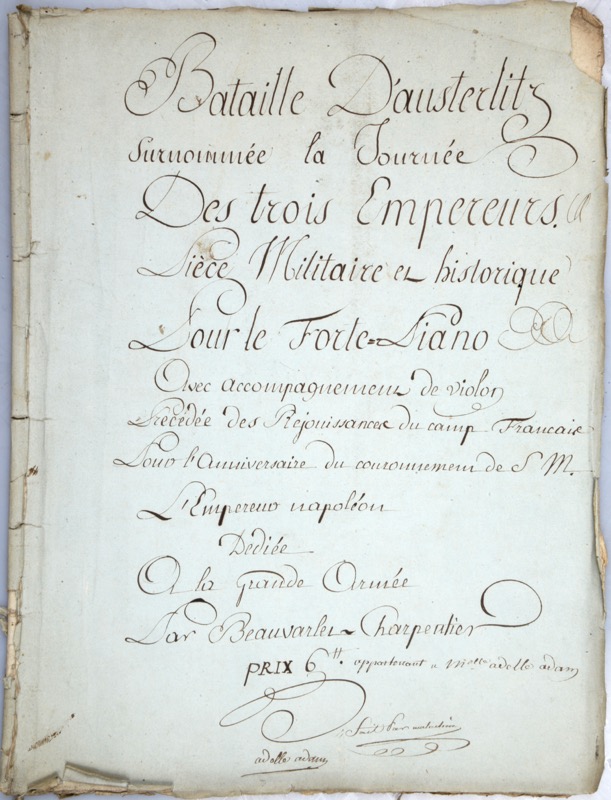 [Musique manuscrite]. Bataille d'Austerlitz surnommée la Journée des trois Empereurs. Pièce militaire et historique pour le Forte-Piano. Avec accompagnement de violon précédée des Réjouissances du camp Français pour l'anniversaire du couronnement de M. l'Empereur Napoléon dédiée à la Grande Armée par Beauvarlet-Charpentier. Prix 6#. Fait par Malachère (?).
