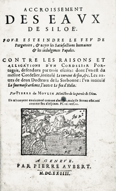 1. Réponse publiée une première fois en 1604 du ministre protestant Pierre Du Moulin (1566-1656) aux trois réfutations de son ouvrage « Eaulx de Siloë pour éteindre le Purgatoire » dans lequel il niait l’existence de celui-ci – du franciscain portugais Jacques Suarez de Sainte-Marie Torrent de feu (1603), Pierre Victor Palma Cayet La Fournaise ardente (1603) enfin André Duval Feu d’Hélie pour tarir les eaux de Siloë (1603). Vignette gravée au titre. Desgraves, 3209. 2. Nouvelle édition publiée une première fois en 1607, trois ans avant l’Anticoton, le fameux pamphlet attribué avec d’autres à Pierre Du Moulin, dirigé en 1610 contre la Compagnie de Jésus et particulièrement contre son représentant à la cour, le Père Pierre Coton (1564-1626) confesseur et conseiller d’Henri IV et de Louis XIII. Vignette gravée au titre. Desgraves 777 (édition 1607). « Athlète intrépide et infatigable du calvinisme pur, Dumoulin soutint d’ardentes controverses, non seulement contre maints docteurs catholiques, mais contre plusieurs de ses coréligionnaires qui s’éloignaient sur quelques points des doctrines proclamées par la confession de foi. Dans toutes ces disputes, il déploya un grand zèle pour les intérêts de son Église et une activité sans égale ; mais on doit regretter qu’il ne se soit pas toujours tenu dans les bornes « de l’honnesteté et de la courtoisie » et que souvent, au contraire, il se soit laissé emporté beaucoup trop loin par l’impétuosité de son caractère » (Haag). Bel exemplaire. Feuillets roussis.