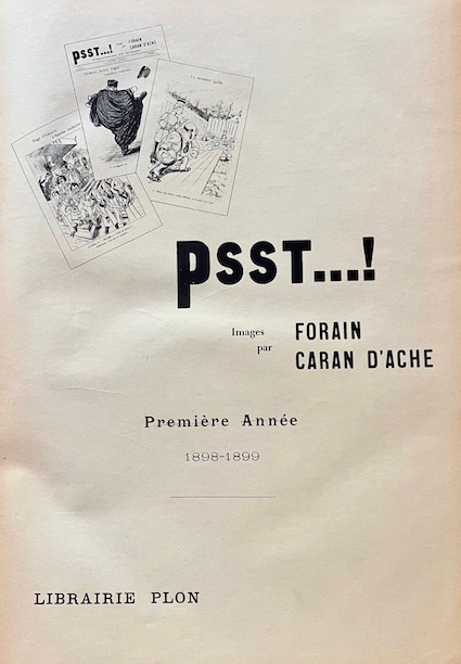 Un des 75 exemplaires tirés sur papier du Japon. Collection complète. Journal violemment anti-dreyfusard publié quinze jours après le fameux « J’accuse » de Zola. Forain et Caran d’Ache, deux des meilleurs caricaturistes de l’époque, n’avaient pas hésité à se lancer dans la bagarre, estimant que le devoir de l’artiste est de s’unir aux autres pour faire luire la vérité. Psst est un journal sans texte, contenant selon les numéros de trois à quatre images. Bel exemplaire.