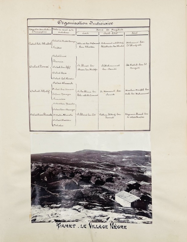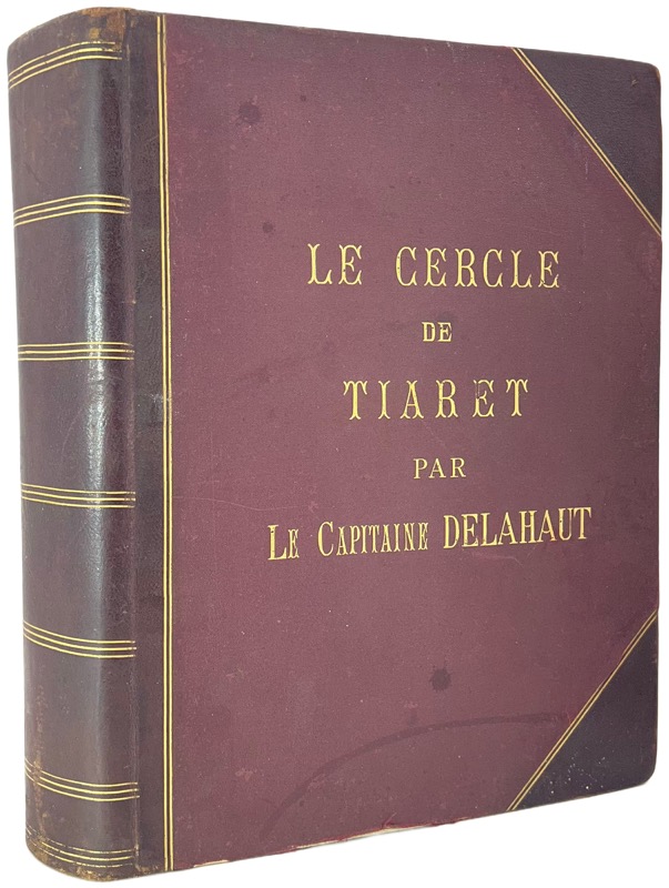 Description inédite de la ville de Tiaret dans le sud oranais à l’époque coloniale, de 1843 à 1902, illustrée de 119 précieuses photographies. « Pendant plus de soixante ans, le Cercle de Tiaret a été administré par l’autorité militaire. Au moment où il vient d’être rattaché au territoire civil, nous avons cru devoir écrire ces quelques pages qui rappellent son glorieux passé. Biskra le 1er janvier 1909 » (préface du capitaine Delahaut). Le 24 mai 1841, Tiaret est prise et détruite par le corps expéditionnaire organisé par le gouverneur général Bugeaud et le général de Lamoricière, après avoir vaincu l’émir Abdelkader. « C’est de 1843, treizième année du règne de Louis Philippe que date la fondation du poste et par suite de la ville de Tiaret, chef-lieu du cercle du même nom. » Le cercle était la plus petite unité de l’administration dans les colonies africaines de la France, composé de plusieurs cantons, qui eux-mêmes se composaient de plusieurs villages. Le commandant de cercle était sous l’autorité du commandant de zone, qui lui-même relevait du gouvernement de la colonie. Sommaire : I. Historique des faits, 1843-1902 (159 pp.) II. Limites (7 pp.) III. Origines et historique des populations, Confédérations des Harrar, des Sahari, Tribu des Guenadza (28 pp.) IV. Familles influentes (24 pp.) V. Topographie (41 pp.) VI. Agriculture, commerce et industrie (18 pp.) VII. Confréries religieuses (17 pp.) VIII. Ruines et monuments romains (23 pp.). Appendices : Étymologie et identité de Tiaret ; Prise de la smala d’Abd-el-Kader (P. Bastard, Le Général Mellinet en Afrique) ; « Autre version de la Prise de la smala d’Abd-el-Kader » (48 pages) Exemplaire unique de ce manuscrit enluminé orné d’un titre décoré en noir et de nombreux dessins et illustrations au lavis (préface, sommaire, têtes de chapitre, lettrines, en-têtes, culs-de-lampe), 2 cartes dessinées à pleine page, 13 cartes dessinées dans le texte, 2 cartes gravées contrecollées à pleine page. En outre, 119 photographies sur papier albuminé, montées dans le texte, illustrent chacune des parties, des vues de la « ville nouvelle » et de ses environs, la population (portraits de groupe et individuels) etc. Précieuse archive coloniale enrichie d’une remarquable iconographie. Le lieutenant Delahaut est cité dans l’Annuaire de l’Armée Française pour 1900 (p. 888, III. Division d’Oran, Cercle de Tiaret). Traces de frottement à la reliure.
