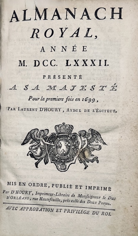 Almanach royal, année 1782. Présenté à sa Majesté pour la première fois en 1699, par Laurent d'Houry, ayeul de l'éditeur. Mis en ordre, publié et imprimé à Paris par d'Houry.
