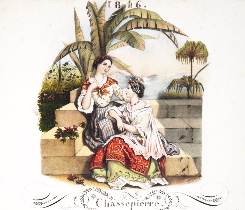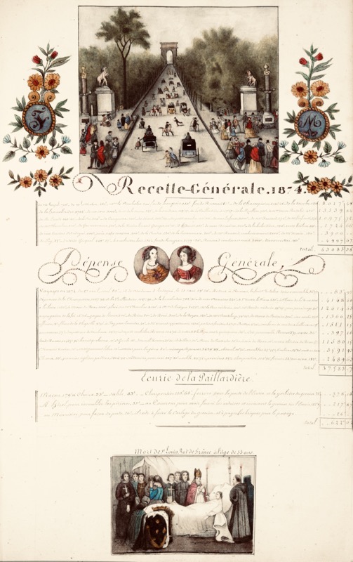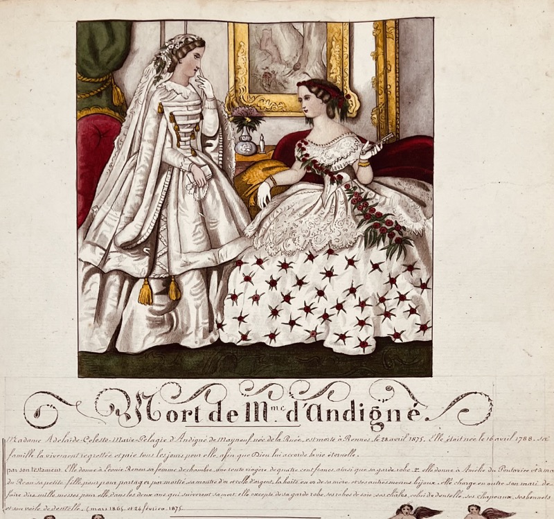 Superbe album de famille entièrement calligraphié, orné et enluminé, réalisé par Adélaïde Céleste de La Ruée dont le contrat de mariage en 1814 avec Didier d’Andigné de Mayneuf ouvre le recueil ; il s’achève le 1er avril 1874 avec la mention « Fin de mon Grand Livre » et la généalogie de la branche Mayneuf d’Andigné sous le titre « Époques de la mort de plusieurs de nos parents ainsi que de leur naissance ». Les années 1875, 1876 et 1877 prolongent l’album avec les recettes générales idoines. « Mr Didier d’Andigné né le 2 mars 1793, conseiller auditeur à la Cour Royale de Rennes a reçu en partage du 4 août 1819, la Métairie de la Paillardière située en St. Gault, la Métairie de la Hamelinière, située en St. Gault & en Quelaines ». Avec les métairies de Chassepierre, Pinellière et la Haute Touche, c’est l’ensemble des recettes annuelles (achats de terres, mises en fermage) de ces différents domaines appartenant à la famille Andigné de Mayneuf qui sont consignés entre 1819 à 1877. Le plan de chaque métairie figurant les chemins et sentiers bordés d’arbres est entièrement dessiné et peint à la gouache dont 1. Année 1827. Métairie de la Paillardière. Plan compartimenté, 23 sections (feuillet 33) ; 2. Année 1829 Métairie de la Chassepierre, paroisse de Quelaines, plan compartimenté 1-21 (f.42) ; 3. Année 1830. Hamelinière. Plan compartimenté 23 sections (f. 48) ; 4. Année 1833 Plan compartimenté 1-15 de la « Pinellière autrement appelée Maison-neuve en St. Gault » (f.58) ; 5. Année 1836. La Haute Touche. Plan compartimenté, sections A-Z (f.65). La remarquable illustration entièrement dessinée et peinte à la gouache, est composée d’une Nativité en frontispice (feuillet 5), d’un titre à encadrement historié pour la naissance en 1823 de Marie-Augustine de Mayneuf du Teillay (f.19) et 185 grandes vignettes couvrant une incroyable variété de sujets dont des portraits et des vues, des scènes de villages, des places publiques, des scènes de piété ou liturgiques dont une prise d’habit d’une religieuse, des scènes historiques, de représentations théâtrales etc. ; elles illustrent aussi les événements familiaux, naissances et décès dont le mariage de Sophie d’Andigné en 1829, la « mort de Mlle Dumesnil notre tante » la même année, la « mort de notre chère Marie le 10 juillet 1847 », la naissance d’Anna le 11 mars 1848 etc. Les dix-neuf derniers feuillets sont illustrés de deux compositions par planche sans texte. Les illustrations dont la veine naïve les rattache à un art populaire d’une remarquable facture, ne sont ni signées ni datées mais probablement l’oeuvre d’Adélaïde d’Andigné de Mayneuf (feuillet 4, un portrait de jeune femme en médaillon est daté « 20 Xbre 1874 »). Le format vignette employé (qui n’excède généralement pas ici vingt centimètres) et le nombre de portraits représentés inscrit également cet album dans le genre de la miniature très en vogue depuis le XVIIIe siècle. Exceptionnel recueil d’art populaire dont chaque illustration d’une grande fraîcheur est une miniature peinte à la gouache, provenant de la famille d’Andigné originaire d’Anjou, établie vers 1525 en Bretagne, où elle a donné plusieurs conseillers au Parlement de Bretagne, à Rennes et le député du Maine-et-Loire Louis-Gabriel-Auguste comte d’Andigné de Mayneuf (1763-1839). [Voir : Andigné, Marie-Antoinette. Généalogie de la maison d’Andigné illustrée de 383 blasons et contenant l’index complet des alliances depuis 1200 et l’inventaire des titres de la maison d’Andigné. [Saint-Poix] (Mayenne) : [M.-A. d’Andigné], 1971].