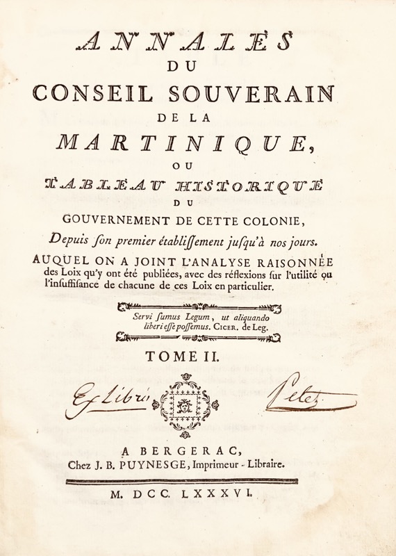 ![[DESSALLES (Pierre-François-Régis)]. Annales du conseil souverain de la Martinique ou tableau historique de cette colonie, depuis son premier établissement jusqu'à nos jours. Auquel on a joint l'analyse raisonnée des loix qui y ont été publiées avec des réflexions sur l'utilité ou l'insuffisance de chacune de ces loix en particulier.](https://bonnefoi-livres-anciens.com/wp-content/uploads/2025/08/43537_1.jpg)