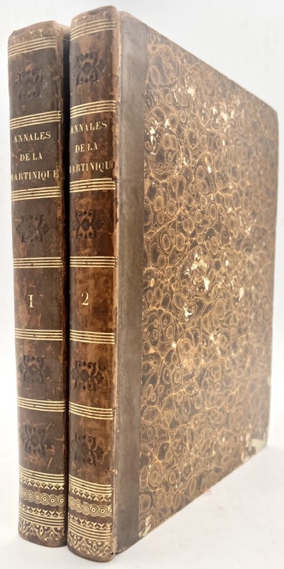 Première édition très rare. Pierre-François-Régis Dessalles, né en 1755 dans une famille martiniquaise établie depuis la fin du XVIIe siècle, est un historien et juriste connu pour ses Annales du Conseil Souverain, une œuvre majeure sur la Martinique sous l’Ancien Régime. Après des études de droit à Paris, il retourne en Martinique, où il occupe des fonctions importantes, notamment comme commandant de Sainte-Marie et juge au tribunal d’appel en 1804. Il meurt en 1808 (certaines sources indiquent 1806). Ses Annales constituent une source précieuse pour comprendre la vie judiciaire, administrative et sociale de la Martinique coloniale. Compilant des extraits de registres aujourd’hui disparus du Conseil souverain, l’oeuvre aborde des thèmes variés : La condition des esclaves, considérés comme des biens meubles, et les sanctions sévères infligées aux esclaves fugitifs (« nègres marrons »). Le service spirituel, confié à des ordres religieux sous l’autorité du Saint-Siège, avec des missionnaires révocables à volonté. Les pratiques judiciaires, y compris des descriptions détaillées de la torture, comme la « question », abolie en 1781 mais décrite comme un supplice « plus douloureux que la mort ». Dessalles, en tant que créole et membre de l’élite, offre un regard à la fois critique et empreint des préjugés de son époque. Il justifie les relations concubines entre maîtres et esclaves comme une conséquence du climat tropical, mais condamne fermement les mariages entre Blancs et femmes de couleur. Les Annales révèlent aussi les tensions sociales, comme les querelles de préséance entre juges de Fort-Royal et de Saint-Pierre. Sur le plan institutionnel, Dessalles décrit l’application des ordonnances royales (civiles de 1667, criminelles de 1670) adaptées aux réalités coloniales. Il critique certaines politiques fiscales, comme la capitation et les taxes sur les produits locaux, tout en documentant les règlements de police régissant la vie quotidienne. En somme, les Annales de Dessalles offrent un témoignage unique sur la Martinique des XVIIe et XVIIIe siècles, mettant en lumière les structures coloniales, les inégalités sociales et les tensions entre colons, administrateurs et esclaves. Malgré les limites de son regard, son œuvre reste une référence essentielle pour l’histoire de la Martinique sous l’Ancien Régime. Natif de Limoges, Jean-Baptiste Puynesge travaille comme compagnon à Bordeaux avant d’y monter une imprimerie clandestine, aux Chartrons. Des poursuites judiciaires l’obligent à partir s’installer à Bergerac vers 1773, d’où il revint pendant la Révolution. Jean-Baptiste Bargeas lui succéda. Vers 1780, Puynesge obtint également l’autorisation d’ouvrir une librairie à Sainte-Foy-la-Grande ; il proposa à cette date à l’intendant d’organiser une loterie de ses livres invendus. Ex-libris manuscrit Pelet ; quelques traces de mouillures. Jean Imbert, Bibliothèque de l’École des chartes (1997), p. 390.