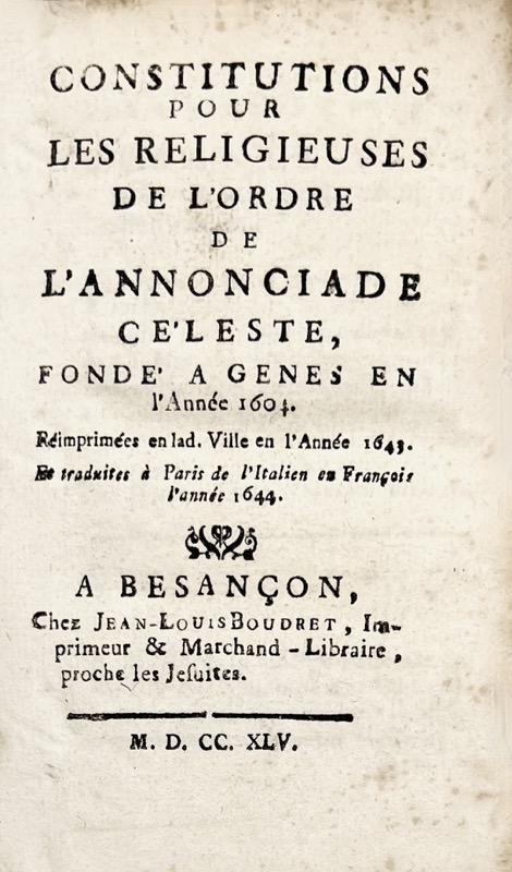 ![[Annonciades de Besançon]. Constitutions pour les religieuses de l’Ordre de l’Annonciade céleste, fondé à Gènes en l’année 1604. Besançon, Jean-Louis Boudret, 1745. In-12 de 148 pp. Règles pour les Officières du monastère de l’Annonciade. Fondé à Gènes l’année de notre Salut 1604. Besançon, Jean-Louis Boudret, 1745. 104 pp. Avis pour les religieuses de l’Ordre de l’Annonciale céleste. Fondé à Gènes l’année de notre Salut 1604. – Image 2](https://bonnefoi-livres-anciens.com/wp-content/uploads/2025/10/44347_2.jpg)