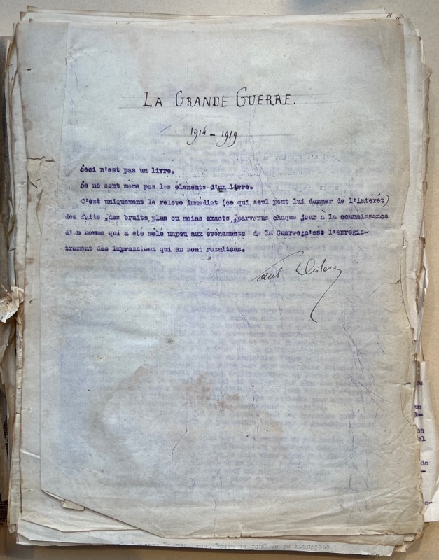 Manuscrit autographe inédit accompagné d’un exemplaire tapuscrit du journal de guerre de Paul Dislère, personnalité éminente de la IIIe République âgé de 74 ans en 1914, polytechnicien (promotion 1859), ingénieur naval et grand administrateur, maître des requêtes, conseiller d’État, président de section des Finances puis de l’Intérieur et du Culte au Conseil d’État, rédacteur de la loi de séparation de l’Église et de l’État. Incipit : « Ceci n’est pas un livre. Ce ne sont même pas les éléments d’un livre. C’est uniquement le relevé immédiat (ce qui seul peut lui donner de l’intérêt) des faits, des bruits, plus ou moins exacts, parvenus chaque jour à la connaissance d’un homme qui a été mêlé un peu aux événements de la Guerre : c’est l’enregistrement des impressions qui en sont résultées. » 31 Juillet. La guerre n’est pas encore déclarée mais elle est inévitable. Je partirai demain pour Paris tacher de trouver un poste qui me permette d’utiliser une dernière fois les forces et surtout l’énergie et la volonté de rendre service au Pays qui peuvent me rester. Veuf depuis peu quand la guerre éclate, Paul Dislère demeure à Paris, quartier de l’Opéra et se déplace parfois à Boulogne-sur-Mer ou dans le sud-ouest. Nommé secrétaire du conseil des travaux maritimes en 1872 Paul Dislère était entré au Conseil d’État en juillet 1879 où il fut nommé maître des requêtes au tour extérieur. Il devint conseiller d’État le 20 décembre 1881, puis sous-secrétaire d’État aux Colonies en 1882. Il démissionna en 1883 suite à l’affaire du Tonkin et rentra en France où il termina sa carrière comme directeur des Colonies au ministère de la Marine, tout en demeurant conseiller d’État, fonction qu’il ne quitta qu’en 1911. Auteur de plusieurs publications, il fut également président de l’École coloniale (fondée en 1889), président de la caisse des retraites de l’Opéra et de l’Opéra-Comique, président du conseil d’administration de l’École coloniale, de la commission des budgets et des comptes du Cercle militaire, contrôleur financier du Cercle militaire. Paul Dislère fut grand-croix de la Légion d’Honneur et officier du Mérite agricole. En 1914, l’en-tête de ses correspondances le présente comme « président de section honoraire au Conseil d’Etat, membre du Conseil de l’ordre de la Légion d’honneur, président de la Commission de la médaille de la Reconnaissance française, ancien sous-secrétaire d’Etat et ancien directeur des Colonies ». Paul Dislère convola le 21 octobre 1918 à Paris 16e avec Marguerite Horville. « La guerre est finie, car les nations secondaires, Autriche et autres, se soumettront rapidement. Mon journal de guerre, que j’ai tenu sans un arrêt pendant 1794 jours, n’a plus de raison d’être, je le ferme. 29 juin 1919. » (explicit). Sources : RHPST (Répertoire de Fonds pour l’Hstoire et la Philosophie des Sciences et des Techniques) : École Polytechnique. Bibliothèque centrale ; article d’Olivier Azzola dans le Bulletin SABIX, no 51 ; Archives de Paris, archives collectées dans le cadre du centenaire de la guerre 1914/1918 in Répertoire méthodique détaillée établi par Marie-Aimée Dubois-Krzynówek sous la direction de Jean-Charles Virmaux.