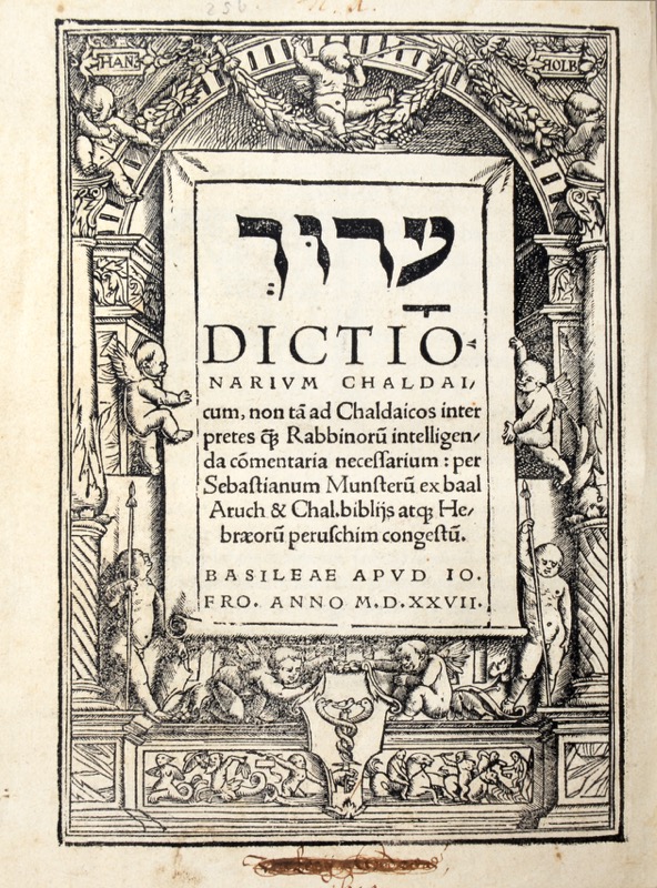 Édition originale du premier dictionnaire araméen imprimé en caractères hébraïques avec définitions latines, largement inspiré de l’Aroukh, le grand lexique talmudique de Nathan ben Yehiel de Rome (1035-c – 1110). Appelé chaldéen au XVIe siècle, l’araméen est la langue parlée du Christ qui fut utilisée pour la rédaction d’une partie de l’Ancien Testament dont les livres bibliques d’Ezra et Daniel. Le géographe, mathématicien, et hébraïste Sebastian Münster (1489-1552), mieux connu pour son oeuvre de cosmographe, se lança dans l’enseignement de l’hébreu et de l’araméen en vue de restituer les textes les plus authentiques de l’époque apostolique. Belle impression en caractères hébraïques et romains sortie des presses de Johann Froben à Bâle ornée de sa marque typographique, une lettrine et un large encadrement historié gravés sur bois par Hans Holbein le Jeune avec sa signature dans les deux cartouches de la partie supérieure du titre. Provenance : Armand de la Rochefoucauld, duc de Doudeauville, et de son épouse Lise Radziwill (ex-libris héraldique). Quelques notes anciennes en hébreu dans les marges. Adams, M-1920 ; Burmeister, 23 ; Hantzsch, p.182 (note 265) ; Heller, The 16th Century Hebrew Book 1:187 ; Prijs 26. STC (German), 633.
