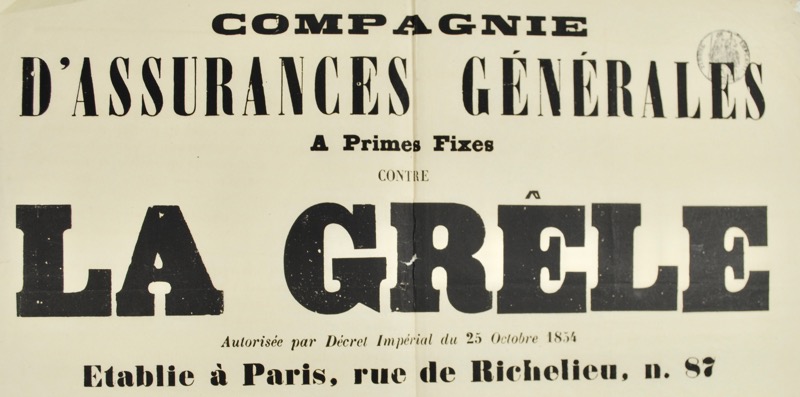 La Compagnie d’Assurances Générales à Primes fixes contre la Grêle a commencé ses opérations en 1855. Depuis cette époque, jusqu’à l’année 1866 inclusivement elle a garanti 1 milliard 430 millions de valeurs et payé 16 millions 650 000 francs à 64 000 propriétaires. Elle assure contre la Grêle toutes les propriétés immobilières et mobilières que ce fléau peut détruire ou endommager, et notamment les céréales, les prairies naturelles ou artificielles, les plantes tuberculeuses, le colza et autres plantes oléagineuses, les vignes, les houblons, les tabacs. Directeur : M. F. de Saint Vidal. (…). Cachet ancien Timbre Impérial.