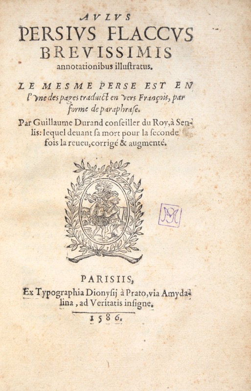 Deuxième édition très rare, revue et corrigée l’année de sa mort de la paraphrase en vers décasyllabiques de Guillaume Durand des six satires de Perse, avec la version latine commentée en regard. La version de Durand est le second essai de traduction en langue française du chef-d’œuvre de Perse. Poète parisien, Guillaume Durand était conseiller du roi au présidial de Senlis ; il a fait publier un recueil de vers – Enchiridion – par le même imprimeur en 1582. Belle impression de l’imprimeur-libraire Denis Du Pré (†1596), libraire juré de l’université de Paris. Natif de Beauvais, il succède en 1565 rue des Amandiers aux libraires Mathieu David et Pierre II Lebert ; il est écroué en 1567 pour vente de livres prohibés. Provenance : Gustave Mouravit (cachet ex-libris au titre répété p. 152) ; monogramme « TR » (mention ms.). Bel exemplaire dont la reliure est attribuée à Joseph-François Dubois d’Enghien (1841-1923), célèbre relieur bruxellois ; cet artisan ne signait que rarement son travail. Brunet, IV, 522 ; Catalogue de la bibliothèque de M. Gustave Mouravit (1938), n°704.