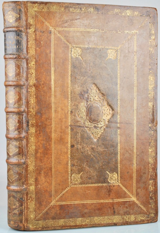 In-folio (41 x 26 cm) de (1) f. de titre, 25-(1) pp., 52 pp., 29 pp. (mal chiffrées 31), 8 pp., 9 pp., frontispice et 75 planches de formats différents, la plupart repliées ou à double page, veau fauve, dos orné à nerfs, pièce de titre en maroquin noir, frise de rinceaux historiés dorée, double encadrement de filets et roulettes dorés avec fleurons aux angles internes, rectangle central teinté orné d’un grand médaillon d’arabesques losangé, roulette sur les coupes, tranches marbrées (reliure hollandaise de l’époque).