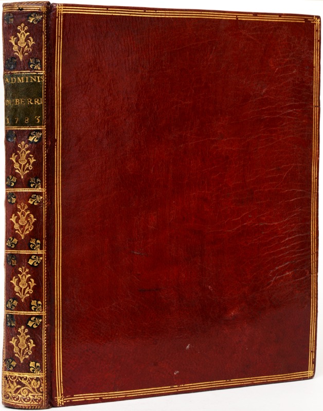 Avec la Haute Guyenne, le Berry servit de ballon d’essai au projet d’assemblées provinciales planifié par Turgot et expérimenté par Necker. Le système sera étendu par Calonne en 1787 à toutes les provinces ne possédant pas d’États. Durant ses années d’existence, à partir de septembre 1780, l’Assemblée du Berry prit d’importantes décisions conformes au programme de Turgot : suppression de la corvée, amélioration des canaux, liberté du travail, faisant de la province un modèle pour l’ensemble de la nation. Les tableaux dépliants donnent les différentes impositions pour le canal du Berry, la taille et le tableau des routes. Superbe et exceptionnel exemplaire recouvert d’une très fraîche et très jolie reliure d’époque en maroquin rouge au dos finement orné.
