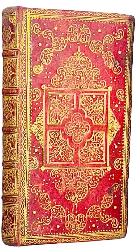 2 parties en 1 vol. in-12 à deux colonnes de (156) ff., frontispice, (104) ff., musique notée, maroquin rouge, décor doré à petits fers sur les plats dans un encadrement de filets et roulettes, traces de fermoirs, dos orné à nerfs, tranches dorées (reliure de l’époque).