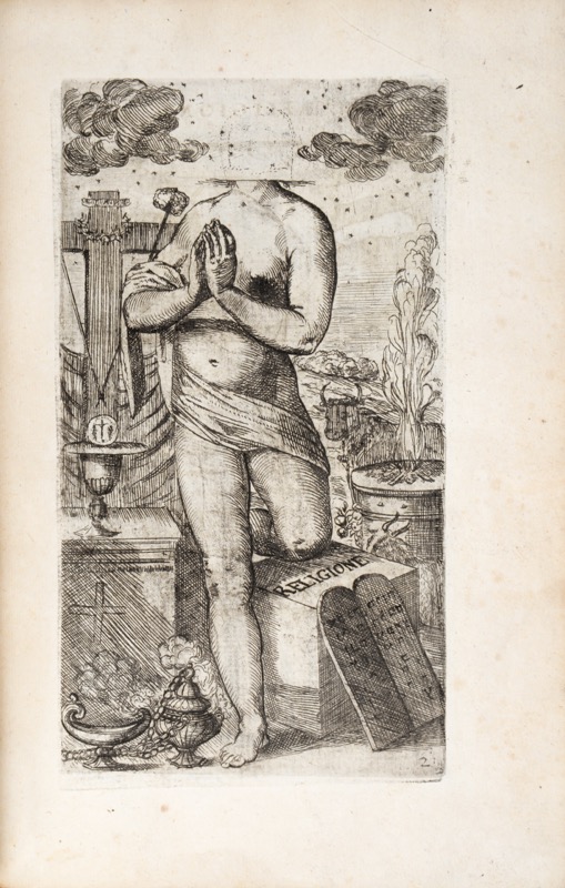 Suite gravée de costumes religieux avec les armes de leur confrérie et leur description en italien au verso de chaque feuillet, par l’artiste bolonais Odoardo Fialetti : 1 figure allégorique et 72 portraits en pied numérotés. Deuxième tirage parisien de 1680 à l’identique de l’original vénitien de 1626 : la suite fut imprimée une première fois en France en 1658 augmentée d’un historique des ordres religieux établi par Raphaël Trichet du Fresne – bibliothécaire érudit et bibliophile de Christine de Suède, il était le fils de l’avocat du Parlement de Bordeaux Pierre Trichet connu pour son cabinet de curiosités. Chaque partie est précédée d’un titre gravé : il apparaît ainsi que notre exemplaire est composé de la première partie historique à la date 1658 et de la suite gravée de 1680. L’épître dédicatoire est adressée à Pierre de La Porte, premier valet de chambre de Louis XIV. « Odoardo Fialetti de son vrai nom Edouard Viallet né à Bologne le 18 juillet 1573, mort à Venise en 1638, est non seulement d’origine française mais savoyarde, ce qu’il faut noter car c’est peut-être le seul artiste de valeur qu’ait jamais donné cette province. Son père, né à Beaufort sur Dozon descendant d’une famille de robe, fut professeur à l’Université de Padoue, puis à l’Université de Bologne, où il mourut comme doyen-recteur. Edouard Viallet, dit Odoardo Fialetti, fut d’abord élève de Cremonini à Bologne se rendit à Rome et à Venise où il entra dans l’atelier du Tintoret. Il convient de rappeler que selon les termes même du grand vénitien, Fialetti fut son « élève chéri » et qu’il le nomma son exécuteur testamentaire. Boschini mentionne trente-huit tableaux de cet artiste, dispersés dans les différentes églises de Venise. Bartsch décrit 243 planches gravées d’après ses propres dessins et d’après d’autres maaîtres, en réalité il faut en compter plus de trois cents dont entre autres une série de costumes des différentes nations et des différents ordres religieux et des motifs décoratifs qui furent recherchés en France par les faïenceries de Nevers qui s’en inspirèrent largement (…) » (Benezit). Bon exemplaire, restaurations aux coiffes. Ex-libris manuscrit à l’encre du temps « Guilliere ». Brunet II, 1241 ; Colas 1061-1062 ; Cicognara 1649 ; Benezit, III, 739.