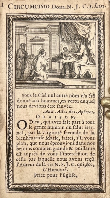 Calendrier des saints illustré de 391 figures gravées vers 1740 par Charles-Grégoire Mathey († 1749) d’après la suite gravée par Sébastien Le Clerc, Pierre Le Paultre et Juan Dolivar publiée à Paris en 1689 par Étienne Gantrel sous le titre Figures des Saints avec un abrégé de leurs vies, à l’usage des congrégations de N.D. érigées dans les maisons de la Compagnie de Jésus. « Cette adresse a fait appeler cette suite Les petits saints de Gantrel pour la distinguer de l’Invocation et l’imitation des Saints pour tous les jours de l’année 1686, planches dessinées et gravées par Le Clerc » (Jombert, Catalogue raisonné de l’oeuvre de Sébastien Le Clerc, 1774, p. LV). Chaque jour est associé à un ou plusieurs saints représentés au recto par une vignette horizontale à l’intérieur d’une bordure rectangulaire verticale où vient s’inscrire une sentence et une prière, suivies au verso de la vie du saint ou le récit de l’événement, le tout traduit du latin en français. Contient : Tome I. Du 1er janvier au 31 mars : 95 figures. Tome II. 8 figures tirées de l’Évangile suivies du 1er avril au 31 mai et du 1er au 31 juillet : 96 figures. Tome III. Du 1er au 30 juin et du 1er août au 30 septembre : 96 figures. Tome IV. Du 1er octobre au 31 décembre : 96 figures. Bel exemplaire, 2 coins émoussés et une petite mouillure sur les feuillets liminaires (tome III). Ex-libris manuscrit répété en tête de chaque volume. Inconnu de Cohen-De Ricci et Grand- Carteret ; [C.G. Mathey] Béraldi, Appendice, III, 744 ; [édition Gantrel 1689] Inventaire du fonds français, graveurs du XVIIe siècle. Tome 13, Pierre Lepautre 1411-1418.