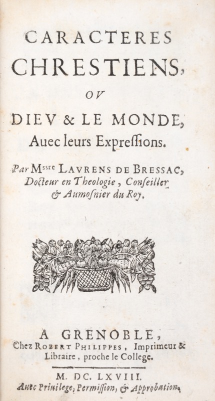 Édition originale. Recueil de sonnets dédicacé à Monseigneur le duc de Lesdiguières dont Caractères de Dieu et ses perfections, Caractères de Jésus-Christ et de ses Mystères, Caractères de Marie et de ses Mystères, Caractères mêlés, Caractères du Monde et de ses vanités (la fortune, le vice démasqué, le blasphème, le démon du jeu, le bal, la comédie, les mascarades, la débauche, le tabac, la mode, les romans, la beauté, le néant de tout, le caractère des caractères. Né à Valence, fils de Henri de Bressac, notaire et bailli de Valence, Laurent-Barthélémy de Bressac entra chez les jésuites à Lyon. Connu comme prédicateur, docteur en théologie et aumônier du roi, il n’a publié outre Les Caractères chrétiens que l’Oraison funèbre de feüe Anne Baillif dame de Pisançon décédée à Grenoble le second jour de juillet 1662 prononcée le dixième du même mois dans l’église des Dames de la Visitation du monastère d’en haut où elle a choisi sa sépulture, et Oraison funebre de tres haut et tres puissant Seigneur Messire François de Bonne de Crequi, Duc de Lesdiguières, Pair de France, Gouverneur & Lieutenant General pour Sa Majesté dans la Province de Dauphiné. Il eut pour frère Charles Jacques de Bressac, conseiller au parlement de Grenoble en 1671. Selon Rochas, il vivait encore en 1680. Provenance : on trouve cet exemplaire décrit dans le Catalogue de livres choisis en divers genres faisant partie de la librairie L. Potier, 2e partie (1855), sous les numéro 1671 et 1899 ; également décrit dans le Catalogue de livres rares et précieux … provenant de la bibliothèque de M. H. B. (1873), n°271 ; Auguste Génard (1819-1908), maître gantier à Grenoble (sans marque d’appartenance). Bel exemplaire dans une reliure signée Simier. Rochas, Biographie du Dauphiné, I, 176 ; L. Côte et P. Berthet, La Flore littéraire du Dauphiné, Grenoble, 1911, II, p. 725-727 ; Catalogue des livres rares romantiques et livres à figures composant la bibliothèque de M. Génard de Grenoble (1884), n°124.