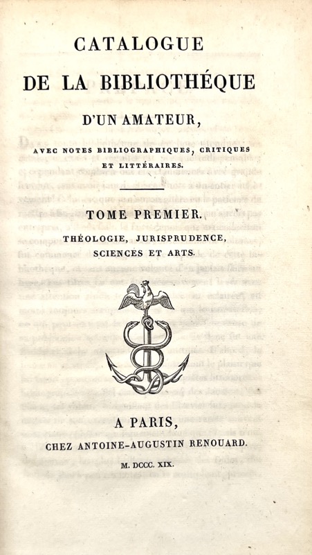 Catalogue de la célèbre bibliothèque Renouard, rédigé lui-même. Très bon exemplaire malgré de menus défauts.