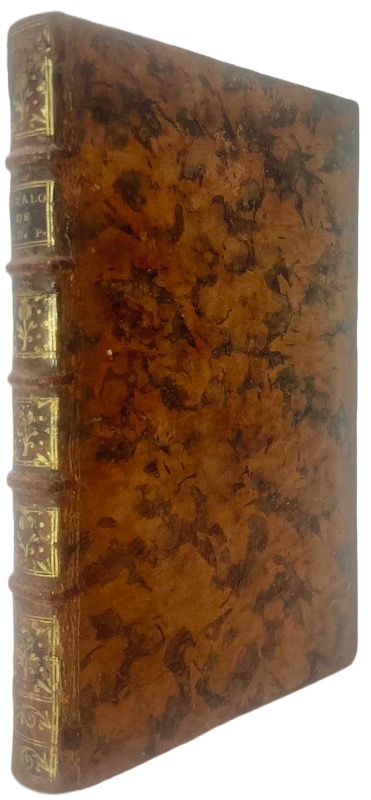 Catalogue de vente de la première collection de livres de Paul Girardot de Préfond (1722-1785?) établi par par l’auteur de la Bibliographie instructive, Guillaume-François De Bure. Précédé d’« Éclaircissements et remarques sur quelques articles précieux de ce catalogue », il est composé de 1428 entrées plus 9 « machines de physique » avec quelques notes manuscrites et les prix de vente à l’encre du temps soigneusement notés en marge. « Aucune indication précise n’a pu être trouvée sur la vie et les origines de Girardot de Préfond. Toutefois de nombreux indices permettent de penser qu’il est issu d’une famille protestante originaire de la région de Clamecy et active dans le commerce et le négoce du bois. Paul Girardot de Préfond est un collectionneur et un bibliophile de tout premier plan au XVIIIe siècle et le fait que ce soit un libraire renommé et spécialisé dans le livre ancien comme Guillaume-François de Bure qui soit chargé de la vente n’est pas un hasard. Dans son Manuel du libraire, Charles Brunet cite à de nombreuses reprises des exemplaires d’ouvrages ayant appartenu à Girardot de Préfond afin de souligner leur rareté et la préciosité des reliures. Sa collection est également citée par de nombreux guides de bibliophilie (Edmond Bonnaffé, Les collectionneurs de l’ancienne France, p. 68-69). Il convient de préciser que Girardot de Préfond a constitué successivement deux bibliothèques et que cette vente de 1757 ne fait pas suite à sa mort mais à son désir de créer une nouvelle collection mieux choisie que la première. Plusieurs de ces ouvrages passèrent dans des collections aussi riches et prestigieuses que celles de duc de La Vallière, de Gaignat ou de Nodier (Brunet, t. 2, col. 553-554) » (Biblissima).