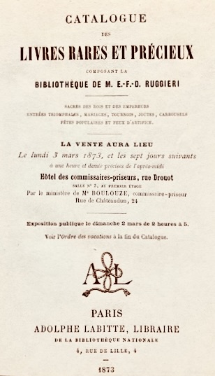 Exemplaire interfolié. La référence en matière de livres de fêtes. A la suite : Prix d’adjudication des livres rares et précieux composant le bibliothèque de M. E.-F.-D. Ruggieri, précédés de la Notice et de la Table des divisions du catalogue. Paris, Labitte, 1873. In-8 broché de (2)-XI-(3)-12 pp., couverture bleue imprimée. Provenance : bibliothèque Jules Janin (Catalogue, 1877, n°1363).