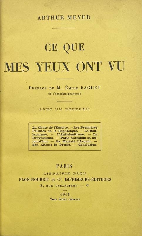 Édition originale. Portrait d’Arthur Meyer (1844-1924) en frontispice. Préface d’Emile Faguet. La chute de l’Empire ; les premières faillites de la République ; le Boulangisme ; l’antisémitisme ; le dreyfusisme ; Paris autrefois et aujourd’hui ; Sa Majesté l’argent ; Son Altesse la Presse. Lipschutz, 431.