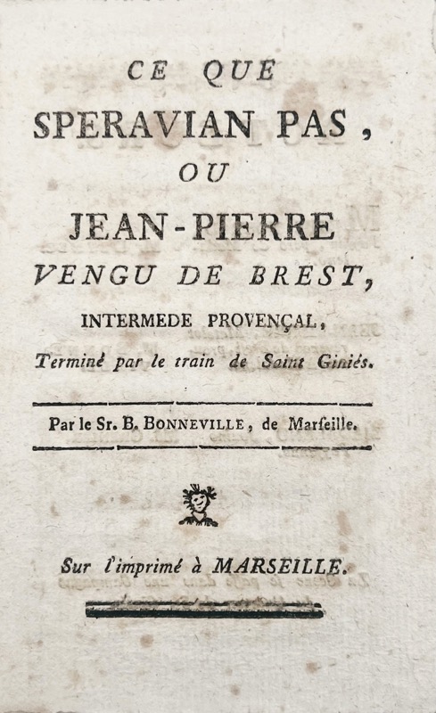 Rare livret de colportage imprimé en provençal à Marseille en 1790, quand il devint suspect d’écrire et de faire jouer des pièces en patois. Comédie en langue provençale donnée par la troupe de Bonnet-Bonneville qui occupait le « Théâtre Beauvau » du nom du Maréchal Prince gouverneur de Provence, qui devint l’Opéra de Marseille. Ces comédies séduisaient un large public mais le 12 mai 1794, le conseil municipal de Marseille interdit la représentation de pièces de théâtre en provençal, au motif que l’unité des Français devait exister jusque dans le langage. Suivi de la chanson en provençal : Per servir noustre pays Enfans , venen de la guerro : Et per la gloiro deis Lis, Fasian su mar è su terro, poun, poun, poun, Trambla l’Angleterro A coous de canoun. Ex-libris gravé « Joannis Antoni Nicola Episcopi Albensis 1832 » (évêque d’Aps aujourd’hui Alba la Romaine, Ardèche). Rousseurs.