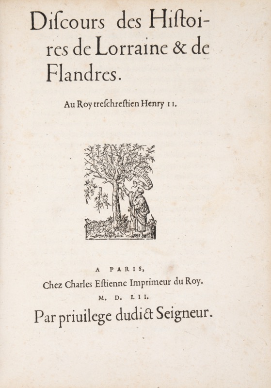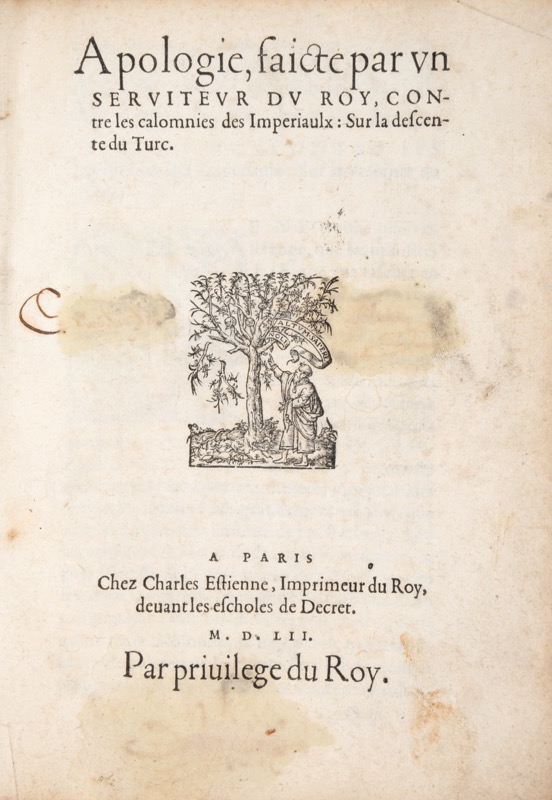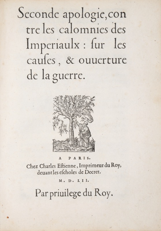 [DANÈS (Pierre)]. Apologie faicte par un serviteur du Roy, contre les calomnies des Impériaulx sur la descente du Turc. Paris, Charles Estienne, 1552. In-4 de (15) ff. et 1 feuillet blanc. page de titre tachée. [DANÈS (Pierre)]. Seconde Apologie, contre les calomnies des Impériaulx : sur les causes, & ouverture de la guerre. A Paris, Chez Charles Estienne, 1552. In-4 de (32) ff. TOLOMEI (Claudio]. L’Oraison du Seigneur Claude Tolomei Ambassadeur de Siene : prononcee devant le Roy, Traduitte d’Italien en langue Françoyse. A Paris, Chez Charles Estienne, 1552. In-4 de (7) ff. et 1 feuillet blanc. [HENRI II, roi de France]. Lettres du Roy escrites aux Princes & Estats du Sainct-Empire. Traduittes de Latin en Françoys. A Paris, Chez Charles Estienne, 1553. In-4 de (8) ff. VILLEGAIGNON (Nicolas Durand de). Traicté de la Guerre de Malte et de l’issue d’icelle faulsemèt imputée aux François. A Paris, Chez Charles Estienne, 1553. In-4 de (32) ff. [GIOVO (Paolo)]. Abbrégé de l’histoire des vicontes et ducs de Milan, le droict desquels appartient a la couronne de France : Extraict en partie, du livre de Paulus Jouius. Avec les pourtraicts d’aucuns desdicts vicontes & ducz, representez apres le naturel. A Monseigneur Anne, duc de Montmorency, pair, Grand Maistre, & Connestable de France. A Paris, Chez Charles Estienne, 1552. In-4 de (46) ff. 10 portraits gravés. [ESTIENNE (Charles)]. Discours des Histoires de Lorraine et de Flandres. Au Roy treschrestien Henry II. A Paris, Chez Charles Estienne, 1553. In-4 de (56) ff. SALIGNAC (Bertrand de). Le Siège de Mets, en l’an 1552. A Paris, Chez Charles Estienne, 1553. In-4 de (88) ff. Manque le plan de Metz. Ensemble 8 pièces en 1 vol. in-4, vélin souple de l’époque.