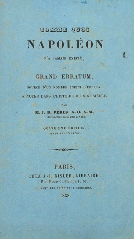 ![[PÉRÈS (Jean-Baptiste)]. Comme quoi Napoléon n'a jamais existé, ou grand erratum source d'un nombre infini d'errata à noter dans l'histoire du XIXe siècle par M.J.-B. Pérès, A.O.A.M., bibliothécaire de la ville d'Agen. Quatrième édition revue par l'Auteur.](https://bonnefoi-livres-anciens.com/wp-content/uploads/2025/08/42755_1.jpg)