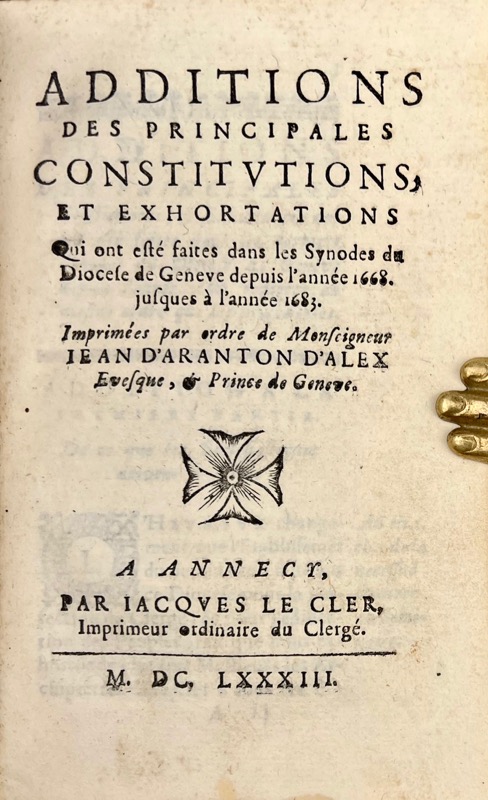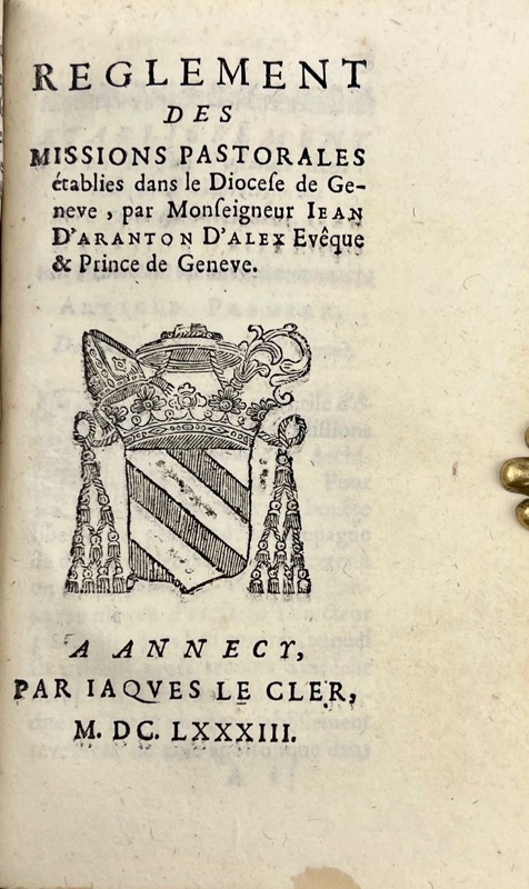 In-12 de (22) pp. 1 f.bl. 343 pp. ARENTHON D’ALEX (Jean). Additions des principales Constitutions et Exhortations. Annecy, Jacques Le Cler, 1683. 48 pp. ARENTHON D’ALEX (Jean). Règlement des Missions pastorales établies dans le Diocèse de Genève, par Monseigneur Jean d’Aranthon d’Alex. [suivi de :] La Société des bons et véritables amys. Annecy, Jacques Le Cler, 1683. 44-11-(1)-14 pp. 3 pièces en 1 vol. in-12, veau brun, dos muet à nerfs (reliure de l’époque).