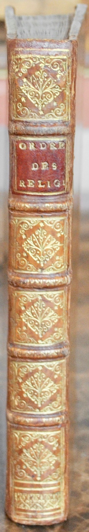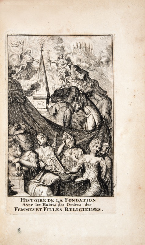 Première édition française publiée l’année de l’originale flamande (1691) qui fait suite à la Courte et solide histoire de la fondation des ordres religieux (1688) – les deux réunis en 1695 sous le titre commun Histoire des ordres religieux (tomes I et II). Titre-frontispice et vignette de titre gravés, 90 planches numérotées pleine-page dans le texte et 1 planche non chiffrée incluse entre les planches 64 et 65. Adriaan Schoonebeeck (1661-1705) fut élève de Romeyn de Hooghe et publia ses premiers travaux de dessinateur et graveur à Amsterdam en 1688 avec les coutumes des ordres religieux. Parti à Moscou où il grava de nombreux portraits dont celui de Pierre Le Grand, il mourut en Russie mais son atelier lui survécut à St Petersbourg par les soins de son neveu Pieter Pickaert. Bel exemplaire imprimé sur grand papier décrit sous le n°1319 du Catalogue De Bure (1853) avec la mention autographe au verso de la première garde : collationné complet le 15 janvier 1826. J.J. de Bure l’aîné – tome 2d de l’histoire des ordres religieux. Collation conforme à Colas, 2684 ; Brunet, II, 338 : « Ce volume se trouve plus difficilement que le premier ; ils sont l’un et l’autre très rares en grand papier » ; Catalogue des Livres de De Bure frères, 1853, n°1319.