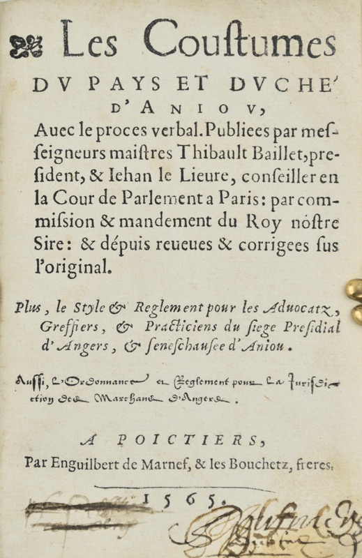 ![[Coutume. Anjou. 1565]. Les Coustumes du pays et duché d'Anjou. Avec le procès verbal. Publiées par messeigneurs maistres Thibault Baillet, président et Jehan Le Lièvre, conseiller en la Cour de Parlement à Paris : par commission et mandement du Roy notre Sire : et depuis reveues et corrigées sur l'original. Plus, le Style et règlement pour les advocatz, greffiers et practiciens du siège Présidial d’Angers et sénéchaussée d’Anjou. Aussi l'Ordonnance et règlement pour la juridiction des marchands d'Angers.](https://bonnefoi-livres-anciens.com/wp-content/uploads/2025/08/42526_1.jpg)