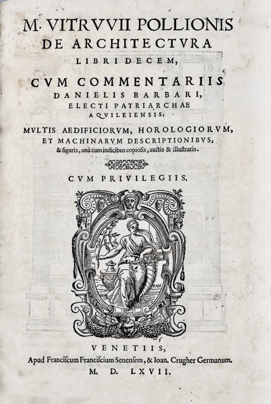 Première édition latine à être accompagnée du commentaire latin de Daniele Barbaro, lequel suit de près l’édition donnée par Guillaume Philandrier à Lyon en 1552. Le seul traité antique d’architecture à avoir été transmis complet, ce qui explique l’immense intérêt qu’il a suscité en Occident, notamment au XVIe siècle. Illustration gravée sur bois dans le texte comprenant environ 130 compositions (dont 3 à pleine page et 3 sur double page). Généralement attribués à Johann Chrieger, ces bois ont été exécutés sur le modèle de l’édition publiée par Marcolini à Venise en 1557 – sauf une vue de Venise en perspective cavalière ici ajoutée. Avec une marque typographique également gravée sur bois, répétée au titre et sur la dernière page. Exemplaire rogné court, rousseurs parfois fortes ; travaux de vers atteignant parfois le texte et les illustrations, un feuillet avec découpure angulaire, quelques feuillets avec taches et mouillures. Fowler, 409 ; Mortimer, Harvard, Italian, 550 ; édition absente de Berlin.