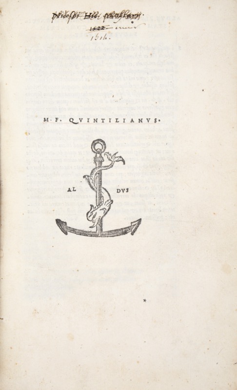 Première édition aldine de l’Institution oratoire avec la lettre-préface d’Alde Manuce (1450-1515) au verso du titre. Colophon : Venetiis, in aedibus Aldi et Andreae soceri mense augusto MDXIIII. Marque à l’ancre au dauphin au titre et au verso du dernier feuillet. Ex-libris manuscrit « F. Boissier » et notes de la même main sur le premier contreplat et sur le titre. Bel exemplaire à grandes marges. Galerie de ver marginale sans atteinte au texte sur les vingt premiers feuillets. Brunet IV, 1024 ; Adams, Q-52 ; ; Renouard, Alde, p 68 n°5 ; Ahmanson Murphy, 124.