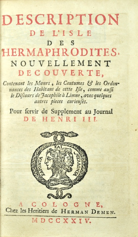 Deuxième édition après celle datée 1605. Relation d’un voyage imaginaire constituant une satire des désordres de la cour d’Henri III et de ses mignons. Illustré d’un curieux frontispice non signé figurant un personnage vêtu en homme mais coiffé en femme, avec deux banderoles dont une légendée « A tous accords » et six vers. Contient également Discours de Jacophile à Limne et diverses pièces dont un catalogue de la bibliothèque (imaginaire) de Mme de Montpensier. Bel exemplaire relié par David. Brunet III, 116 et V, 831 ; Gay II, 464-465 ; Lever, p. 181 ; Roméo Harbour, L’Ere baroque en France, I, p. 562, 4395.