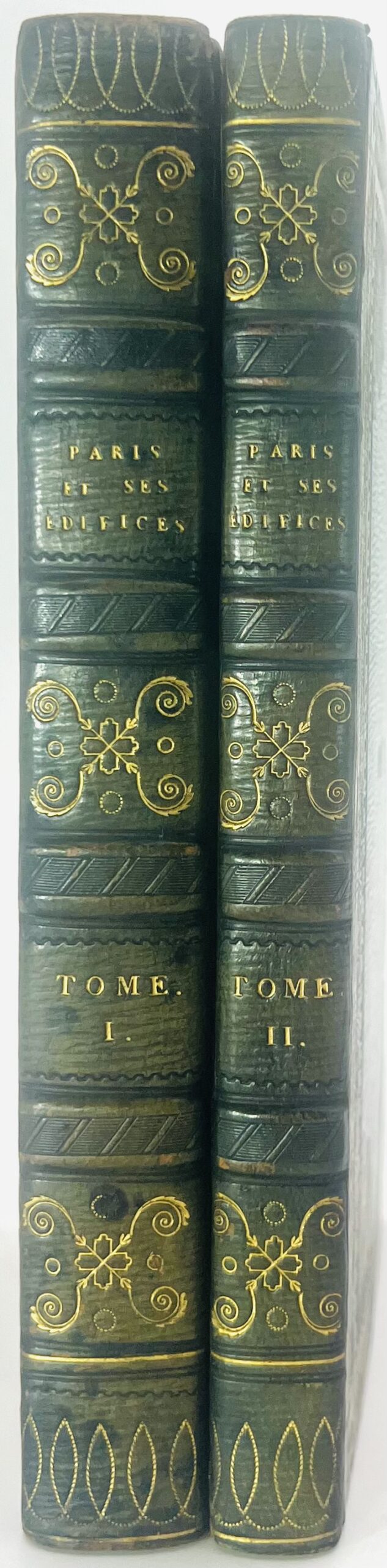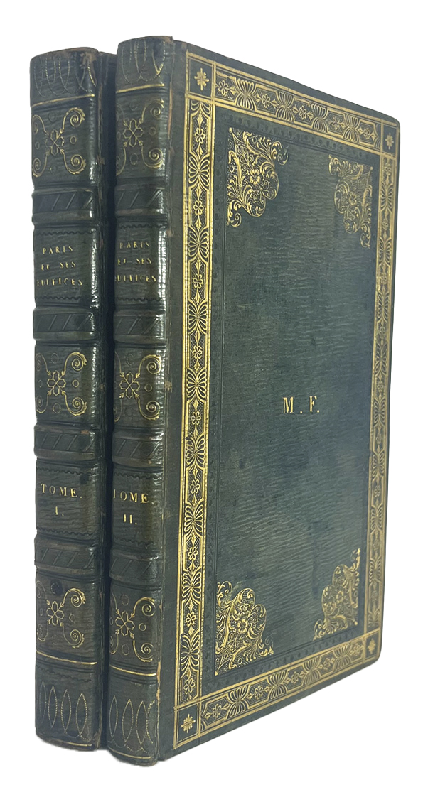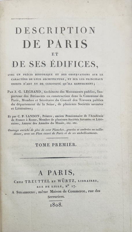 Édition originale avec un titre de relais à l’adresse de Treuttel et Würtz et à la date de 1808. Elle est ornée de 98 planches hors texte, dont 3 repliées, gravées en taille-douce sous la direction de Landon et d’un plan replié, gravé et d’après Charles Picquet, « avec tous les changements survenus jusqu’en 1809 ». La mort de l’auteur Jacques-Guillaume Legrand, après la rédaction de sa première partie, provoqua le retard de la publication de la deuxième partie « Des Palais », qui fut confiée à Quatremere de Quincy. Goulet prit la suite de celui-ci et rédigea la troisième partie intitulée « Places, fontaines, théâtres et autres édifices d’utilité publique ». L’ouvrage annoncé comme contenant « plus de 100 planches » est complet avec 98 planches numérotées selon l’avertissement des auteurs qui stipule que « le lecteur est prié d’observer que les planches XXIII, XXXIV et XXV, de la seconde partie (dans lesquelles on a cru devoir réunir, pour les mieux comparer, les différentes façades des Tuileries et du Louvre), sont par cette raison d’une dimension quadruple, et, selon l’usage, comptées dans cette proportion, ce qui porte le nombre effectif des planches à 107 ». Exemplaire relié sans les faux-titres dont les feuillets de titre ont été découpés dans la marge supérieure, sans atteinte au texte ; quelques rousseurs, traces de frottement à la reliure. Bel exemplaire conservé dans sa reliure romantique de l’époque au chiffre « M.F. » non identifié. Mareuse, 321.